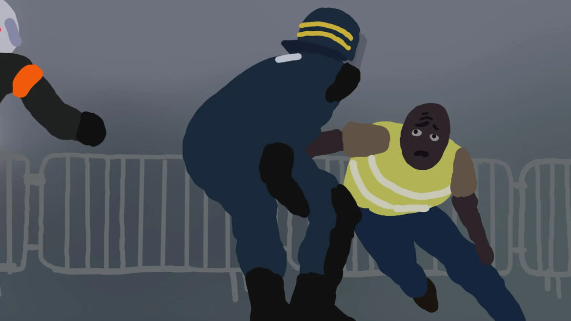 During a protest, two law enforcement teams face off on the field.