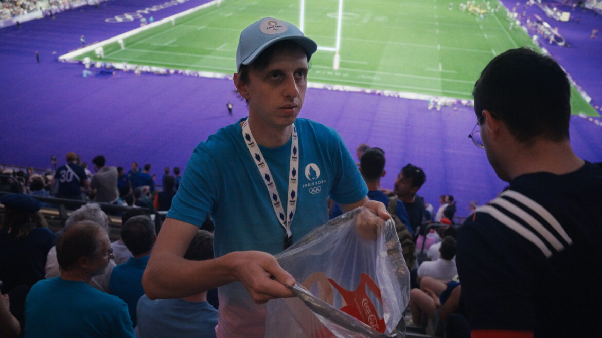 C’est l’été, Ferdinand n’a pas d’argent et les J.O. envahissent Paris. Un sac poubelle à la main, il sillonne les gradins bondés du stade de France et ramasse les déchets des supporters euphoriques. La nuit, il retrouve Juliette, sa seule amie pour jouer de la musique dans une cave. Ensemble ils bricolent des chansons qu’un jour ils oseront peut-être montrer à un public.