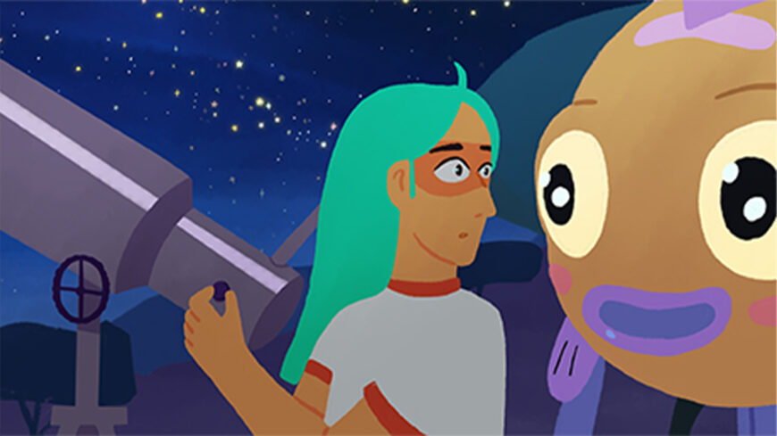 Esther regarde le ciel à travers un télescope. À côté d'elle, une créature mi-humaine mi-poisson tente d'attirer son attention, en vain. Mais qu'est-ce que ces étoiles ont de si intéressant ?